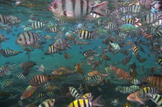 Our stay at the Redang Holiday villas included snorkelling trips, so we joined the vast swathes of Japanese/Malaysian tourists and boarded the boat to the marine park. It was slightly concerning that everyone else had bright lifejackets on, but knowing that it’s hard to sink when swimming in the sea, it was just put down to a quirk. There were certainly more fish at the marine park’s small cordened off snorkelling area (to protect us from the boats…), alas that’s probably due to them being fed by the tourists. We had a couple of hours to float around, trying to avoid the flailing arms of people trying to swim with lifejackets on, and momentarily losing each other in the thick school of fish (see picture!) Leaving the park, there was the definite feeling that the “park” bit of marine park is as in theme park, not ecological park – half of the area has dead coral, and there was loads of plastic bread bags left floating on the surface, they could do with some Kiwis or Aussies to come and sort it out!